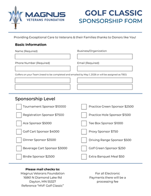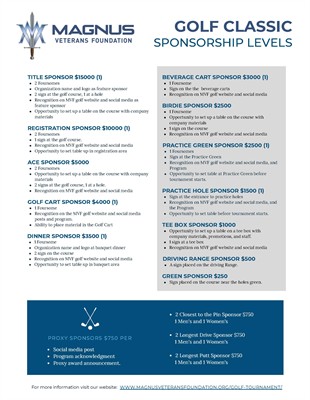 Smart Pin Sponsor, Logo and short ad in the video of every golfer will get of there shot. $10 entry fee for every Golfer to participate for the chance to win money for them self and the Magnus Veterans Foundation.