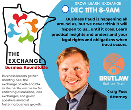 Chamber member Craig Foss, Attorney with Brutlaw, will discuss: Business fraud is happening all around us, but we never think it will happen to us... until it does. Learn practical insights and understand your legal rights and obligations when fraud occurs.
