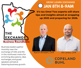 Chamber member COPELAND BUHL will lead the exchange on taxes. It's the perfect time of year to wrap up your 2025 tax profile, and set yourself up for success in 2026. Hear the lates tips and advise from the experts.